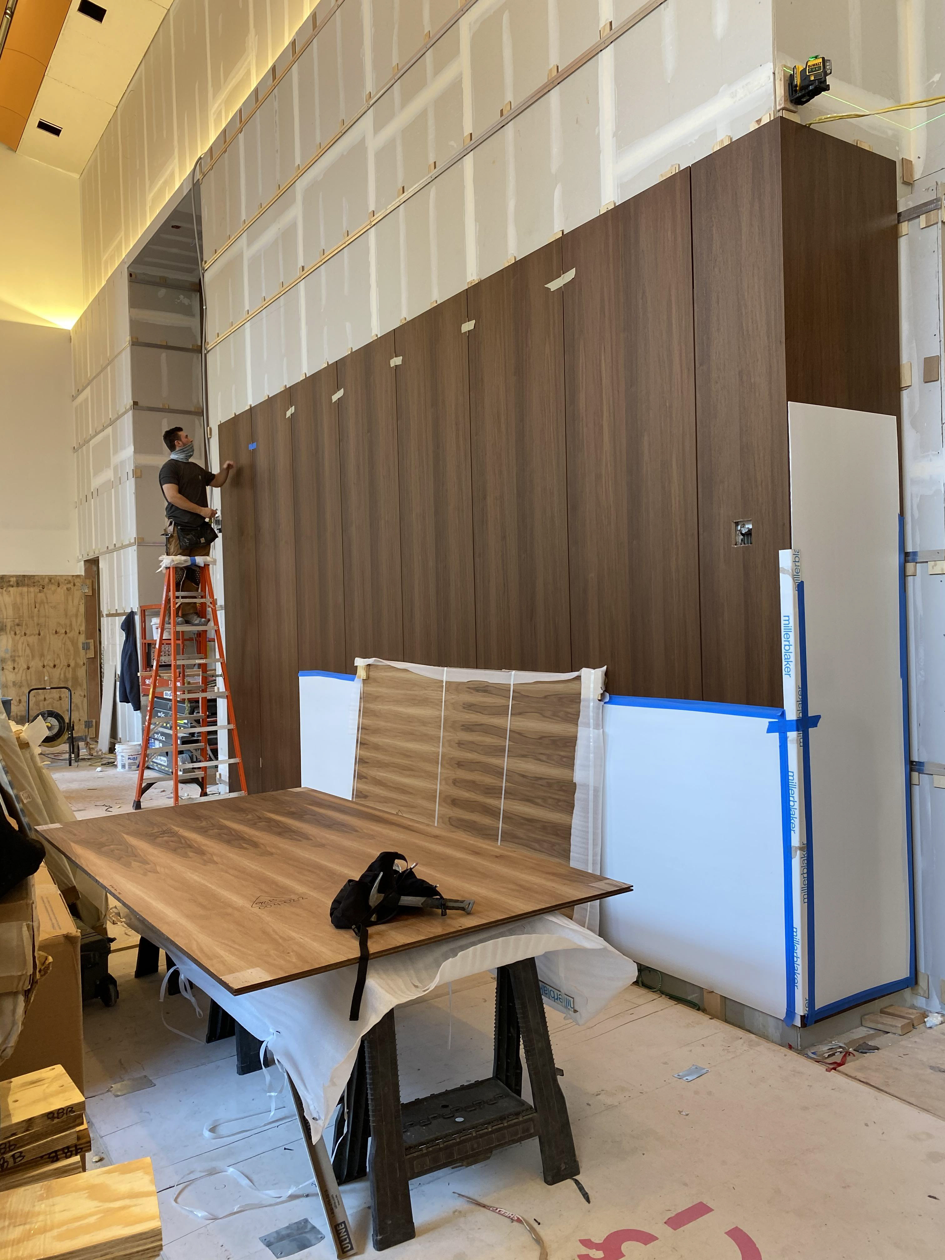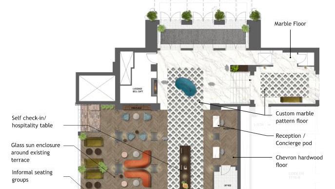 Divided into two wings, the west wing features a concierge desk, flexible auditorium, large board room, and meeting area. These spaces can be transformed to host a variety of events, and feature movie-theater quality Dolby surround sound audio equipment. In the boardroom, the team designed an intricate custom ceiling that illuminates at night and can be seen from the street by passersby. In the east wing, the Grand Gallery contains a double-height space with open, flexible seating, high-top tables, and a casual grab-n-go food area. Overlooking Grand Central Terminal, the Gallery opens up onto the 3,000-square-foot terrace that acts as a continuation of the informal seating area.